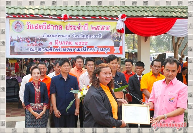 วันที่ 8 มีนาคม 2555 คณะครูกศน.ตำบลบ้านดุงได้เข้าร่วมกิจกรรมวันสตรีสากล ประจำปี 2555 ณ สวนรักษ์เทศบาลเมืองบ้านดุง อำเภอบ้านดุง โดยมีท่านนายอำเภอบ้านดุงเป็นประธานในพิธีเปิด โดยมีกลุ่มสตรี จาก 12 ตำบลและ 1 เทศบาล ในเขตอำเภอบ้านดุง เข้าร่วมเป็นจำนวนมาก